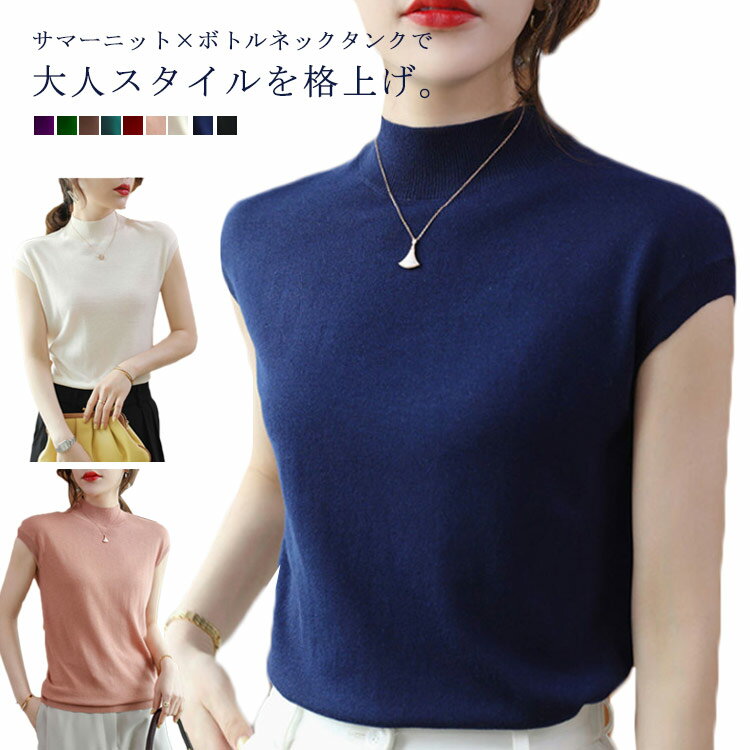 送料無料 タンク サマーニット 夏 ハイネック ノースリーブ トップス モックネック 小顔効果 夏コーデ 夏新作 ボトルネック