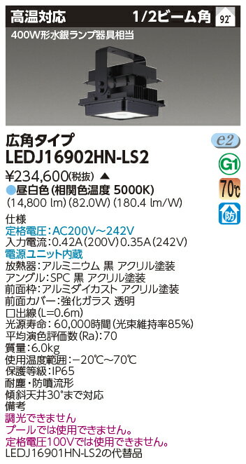 楽天カード会員ならポイント1倍還元でさらにお得に購入できます。送料は送料別、[法人限定] LEDJ16902HN-LS2 東芝 ※受注品 LED 高天井器具 高温対応 400W形水銀ランプ器具相当 広角 昼白色 [ LEDJ16902HNLS2 ]の最新価格・在庫状況は下のボタンから確認できます。